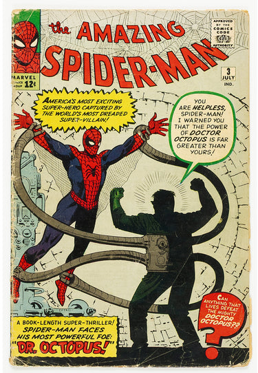 Origin and first appearance of Doctor Octopus. First full-length Spider-Man story. Human Torch appearance. Steve Ditko cover, art, and Spider-Man pin-up page. |