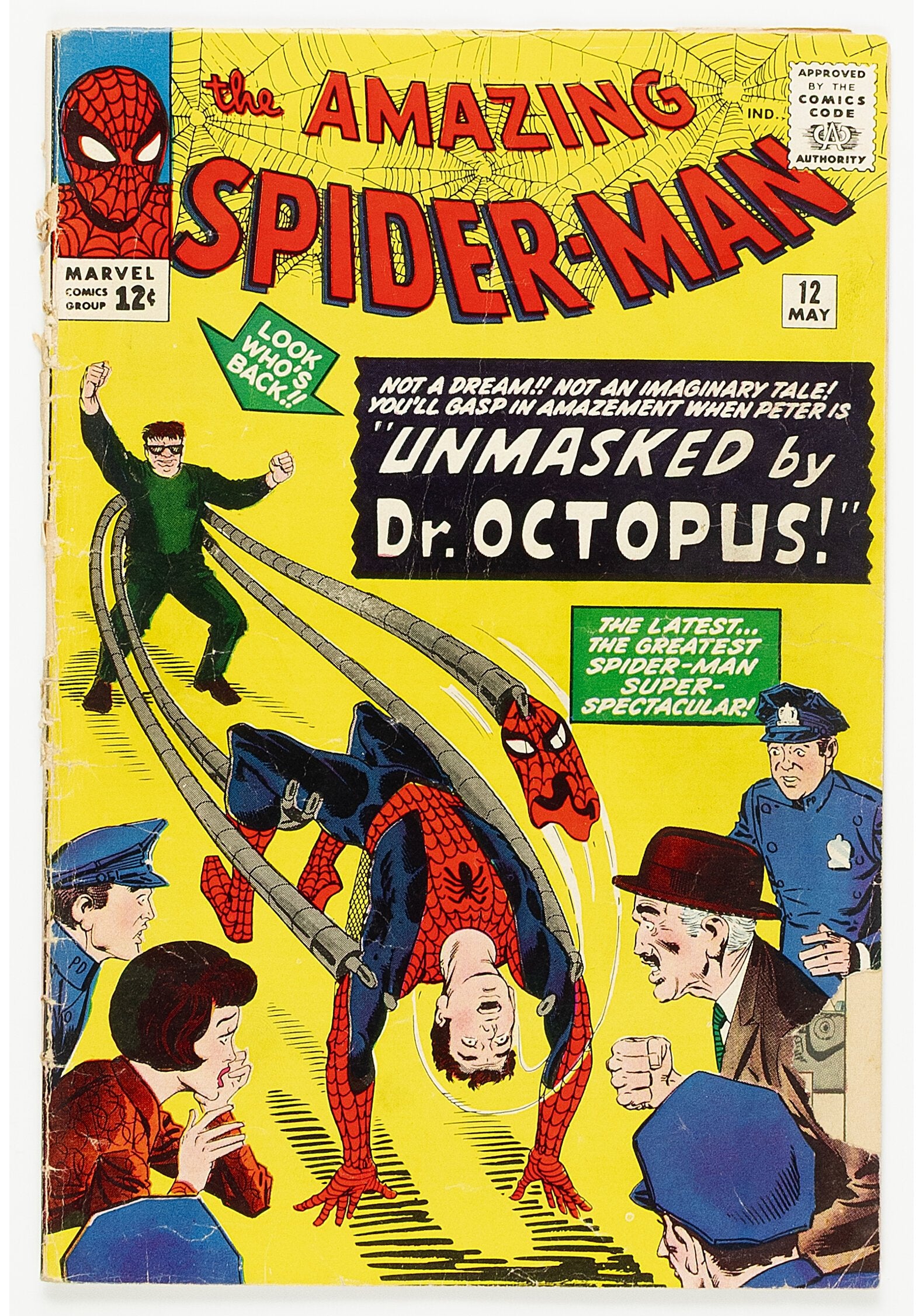Doctor Octopus (in his third appearance) unmasks Spider-Man. Steve Ditko cover and art. Has a 1.25" piece missing from the right of the front cover, and a 1" spine split above and below the top staple.