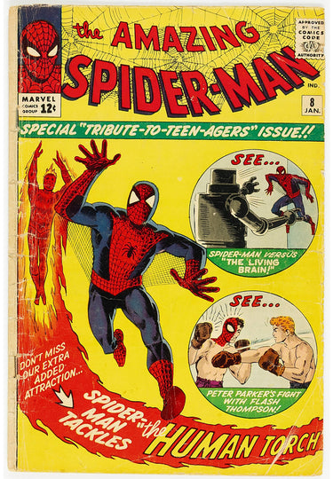 The first appearance of the Living Brain. Peter Parker gets into a fight with Flash Thompson, and the Fantastic Four make appearances in a back-up story with art by Jack Kirby and Steve Ditko. |