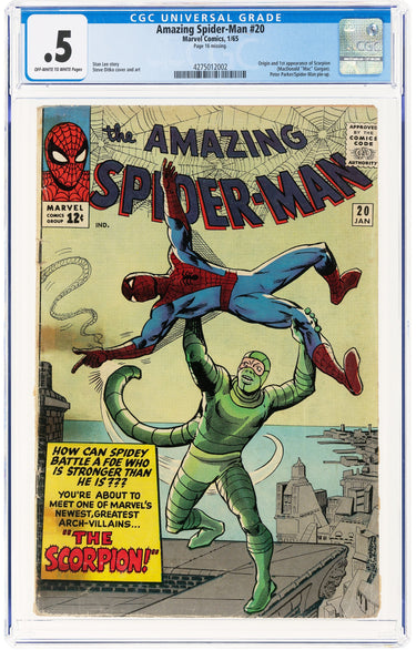 Origin and first appearance of the Scorpion. Contains a Peter Parker / Spider-Man pin-up. Steve Ditko cover and art. CGC notes, "Page 16 missing." |